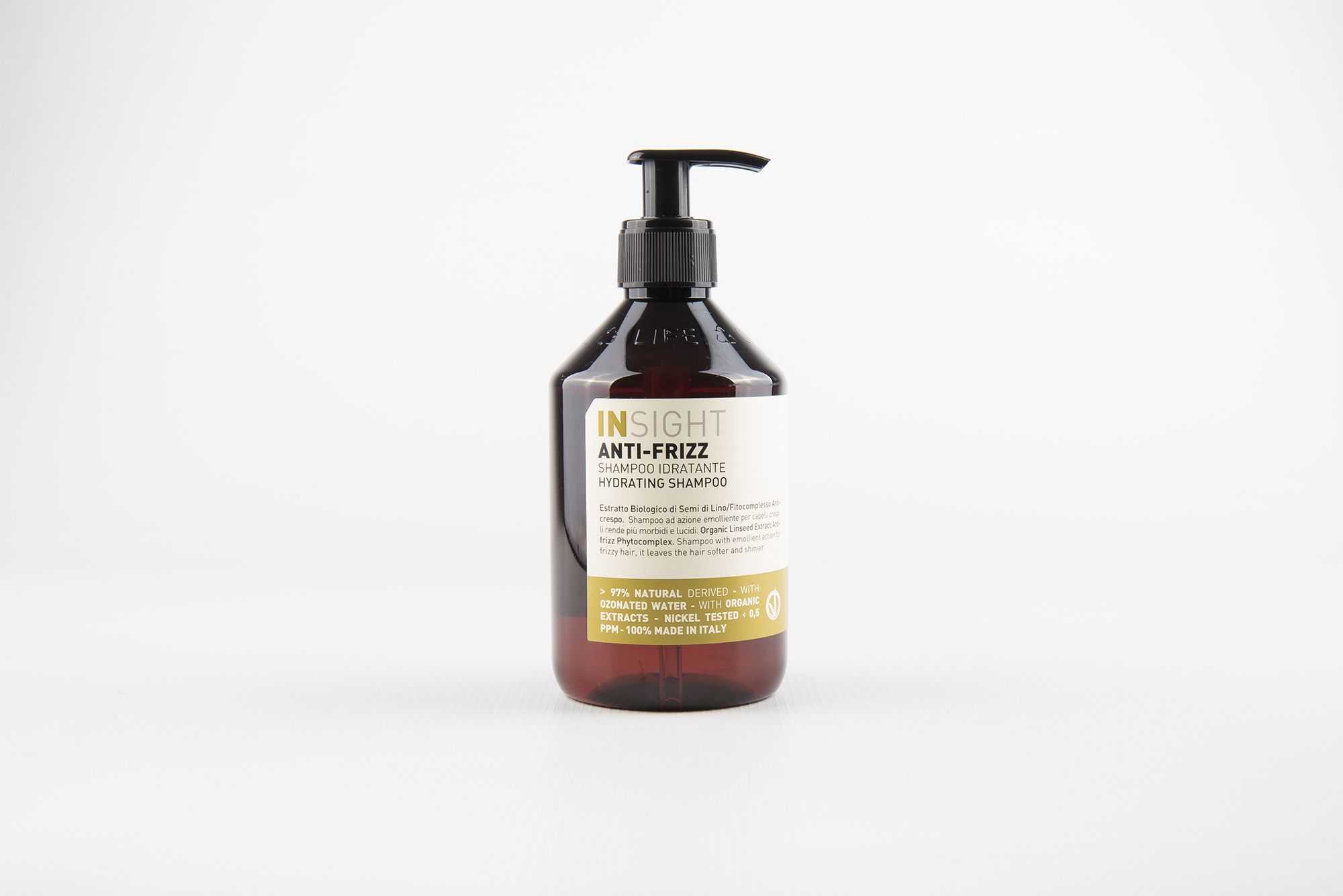 Questo shampoo professionale Insight è a base di Estratto Biologico di Semi di Lino e Fitocomplesso Anticrespo (Burro di Cacao, Olio di Cotone, Olio di Canapa).